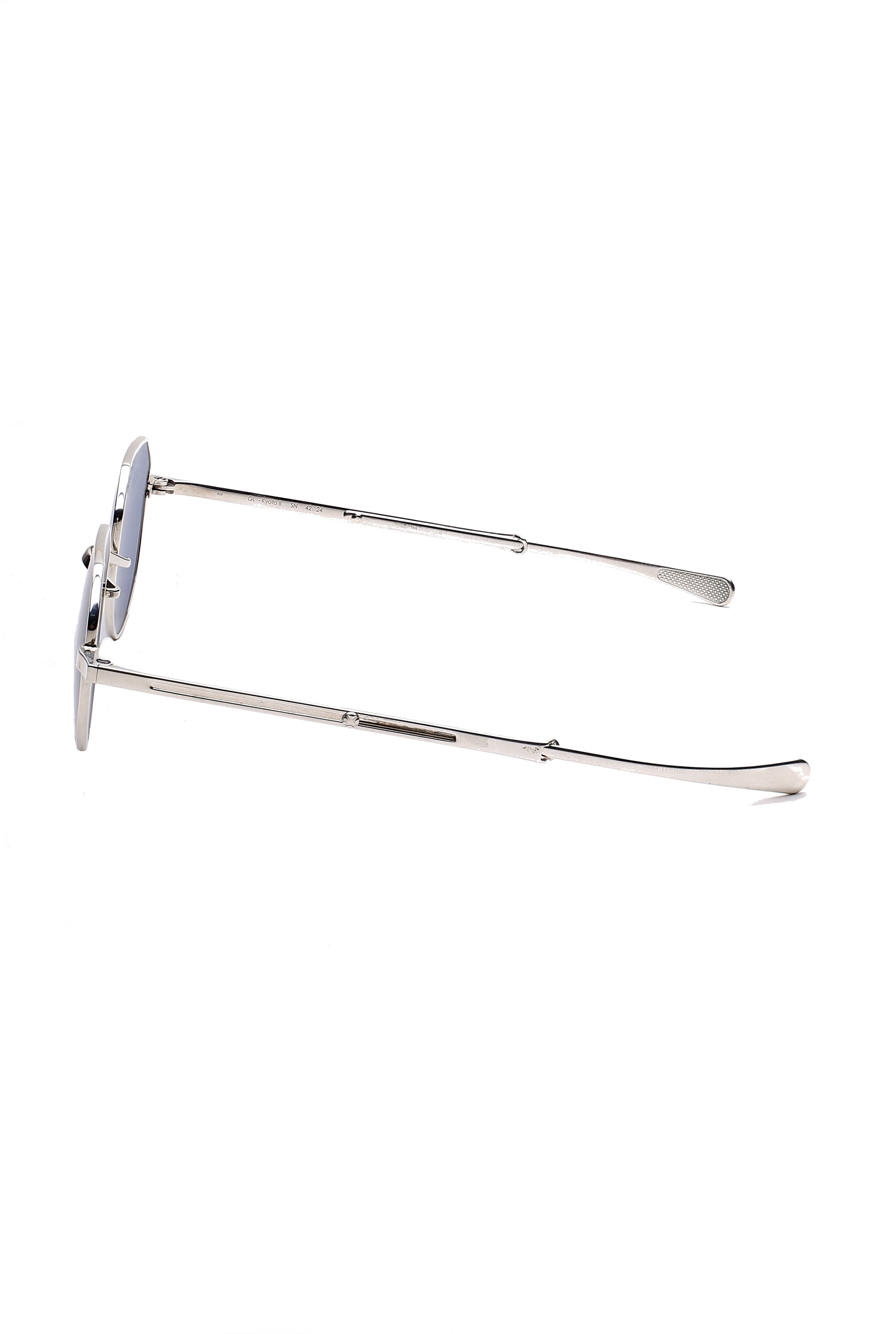 Gernot Lindner GL Kyoto II sn Modell Sonnenbrille, runde Form ausziehbarer Stab Einzelstück im Shop individuell angefertigt, in Silber handgefertigt in Deutschland.