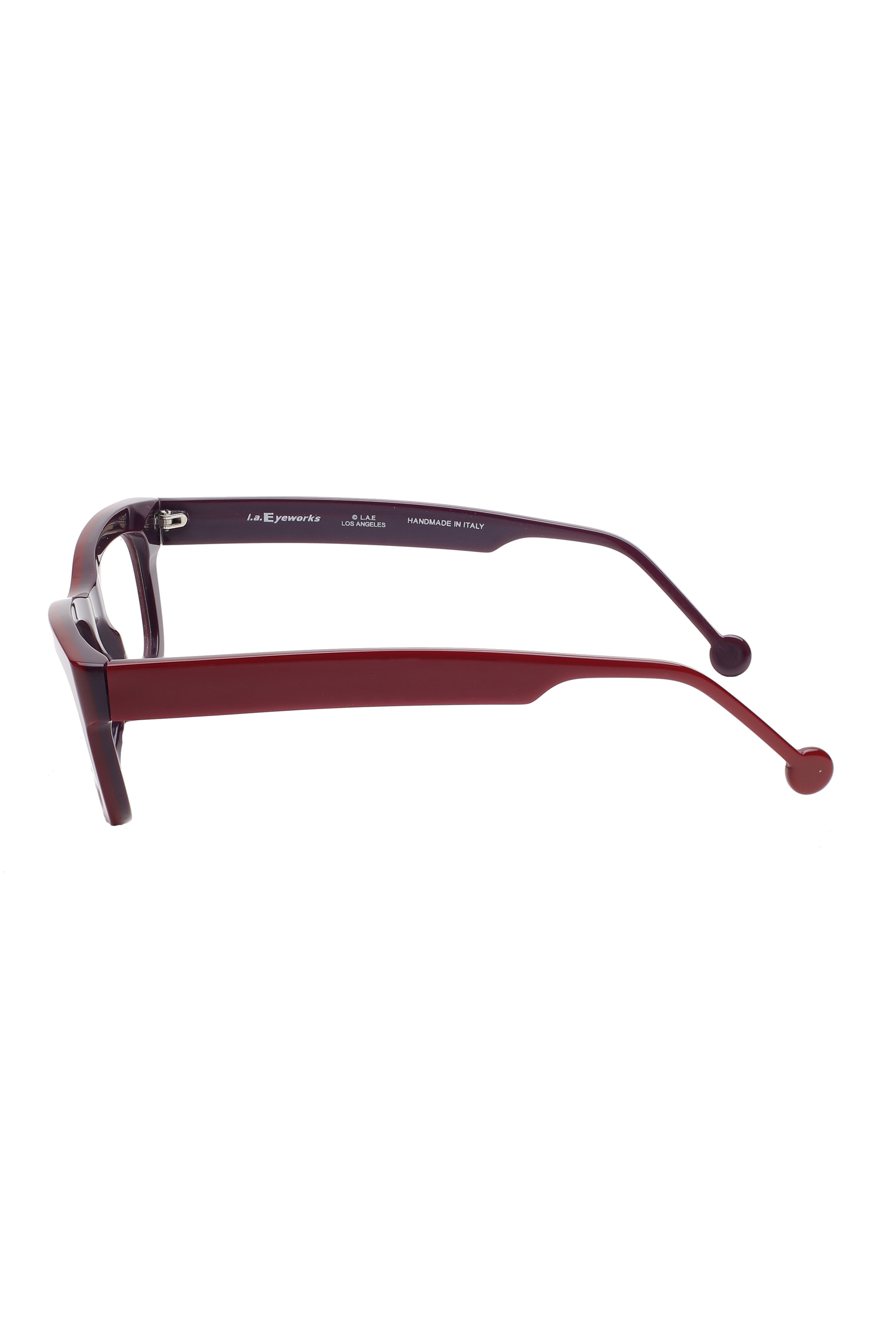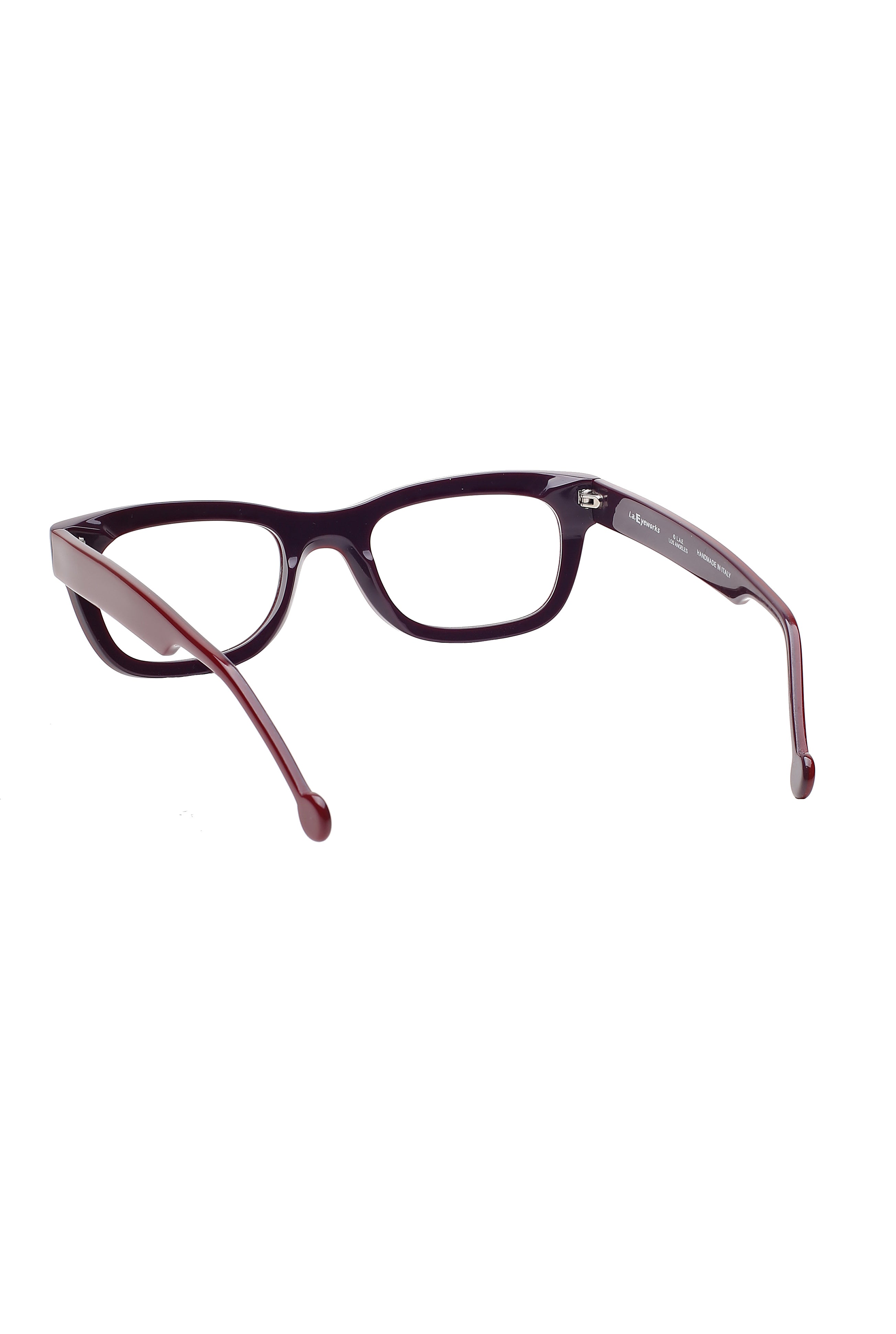 L.A. Eyeworks Big Whell 631 modello da vista colore rosso, forma rettangolare in acetato fatto a mano in Italia.