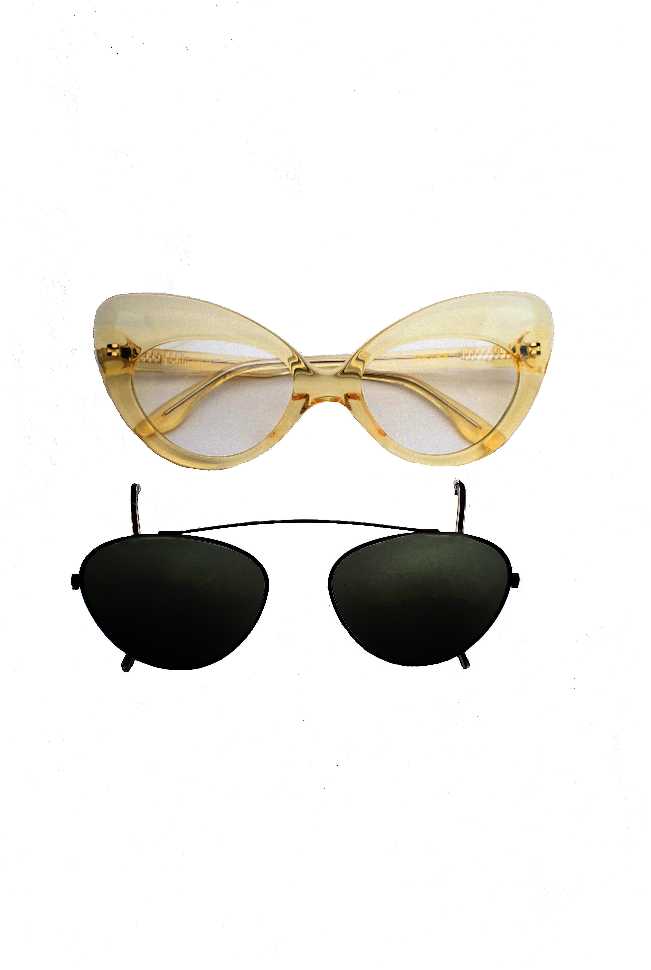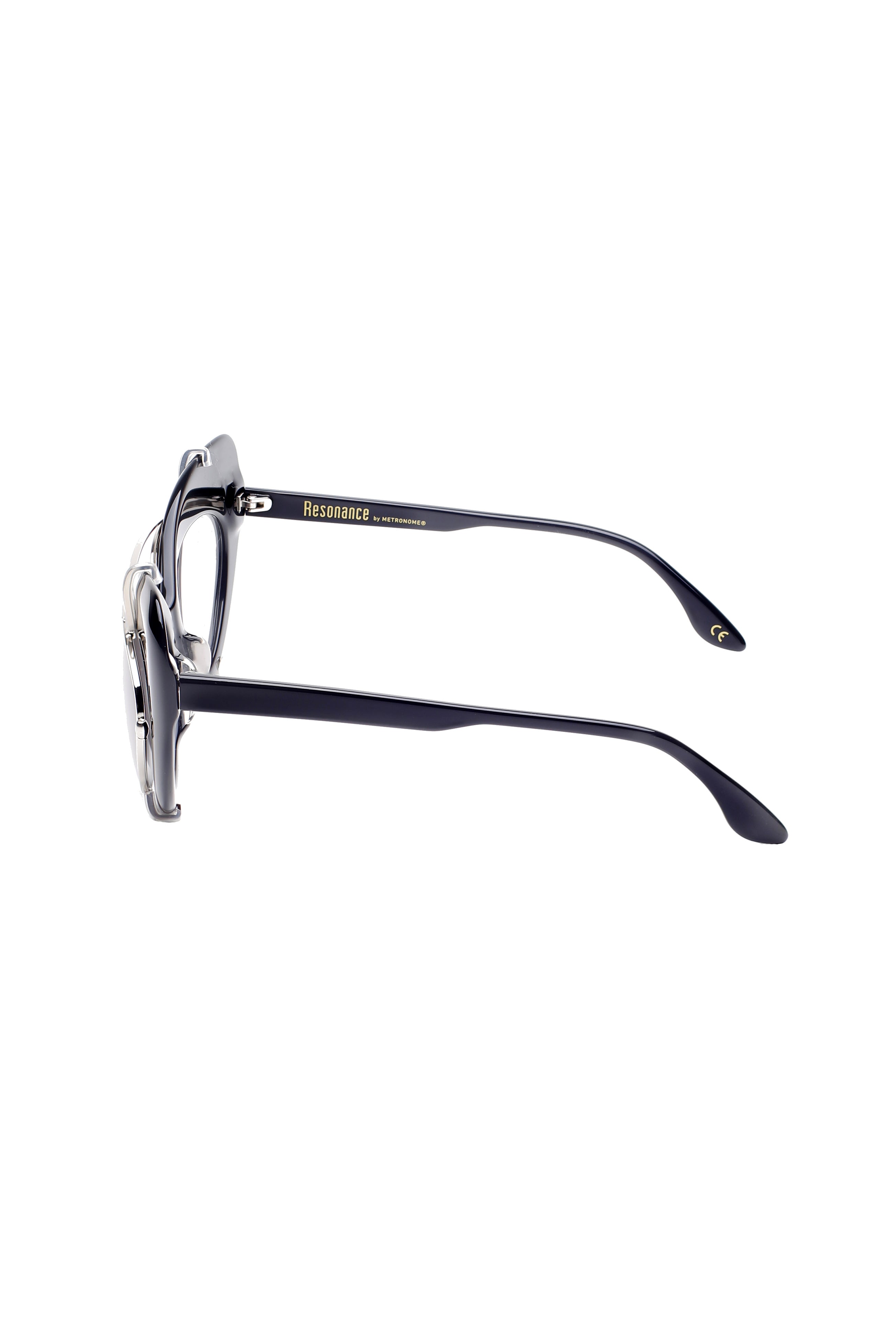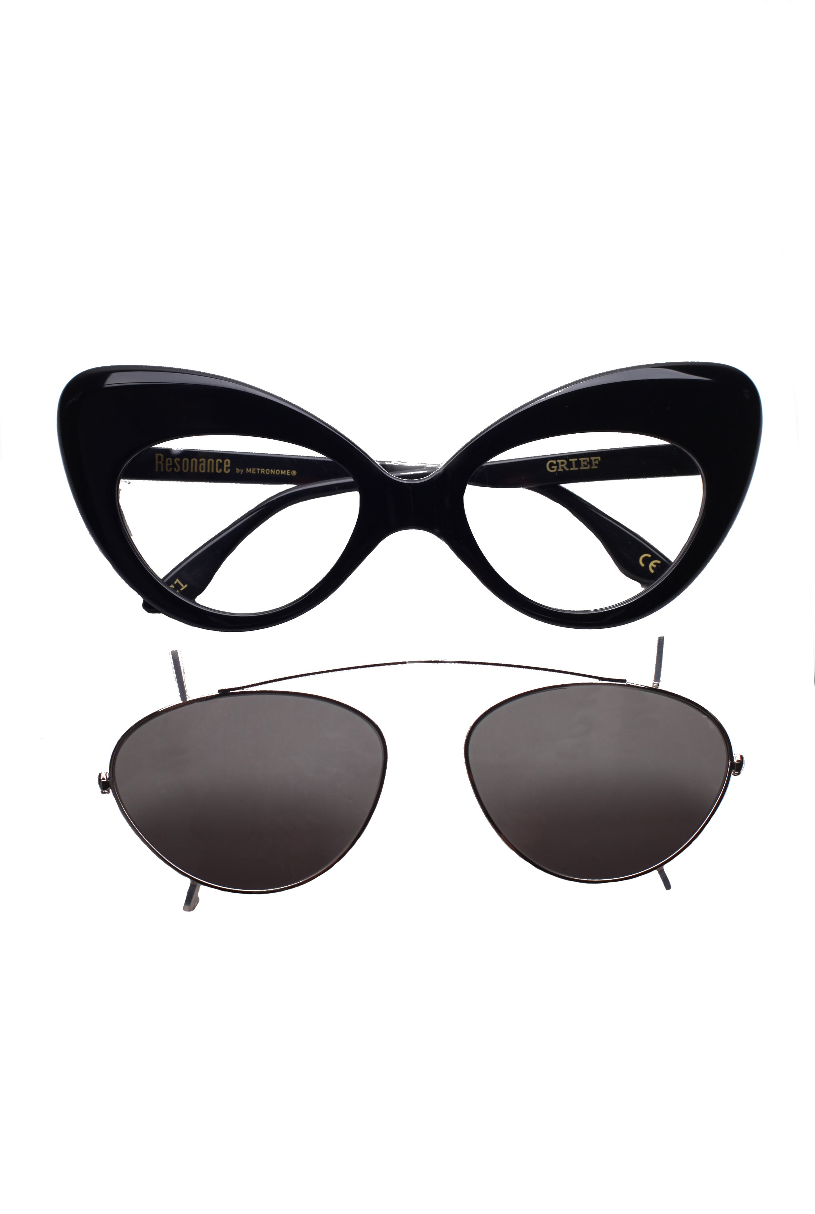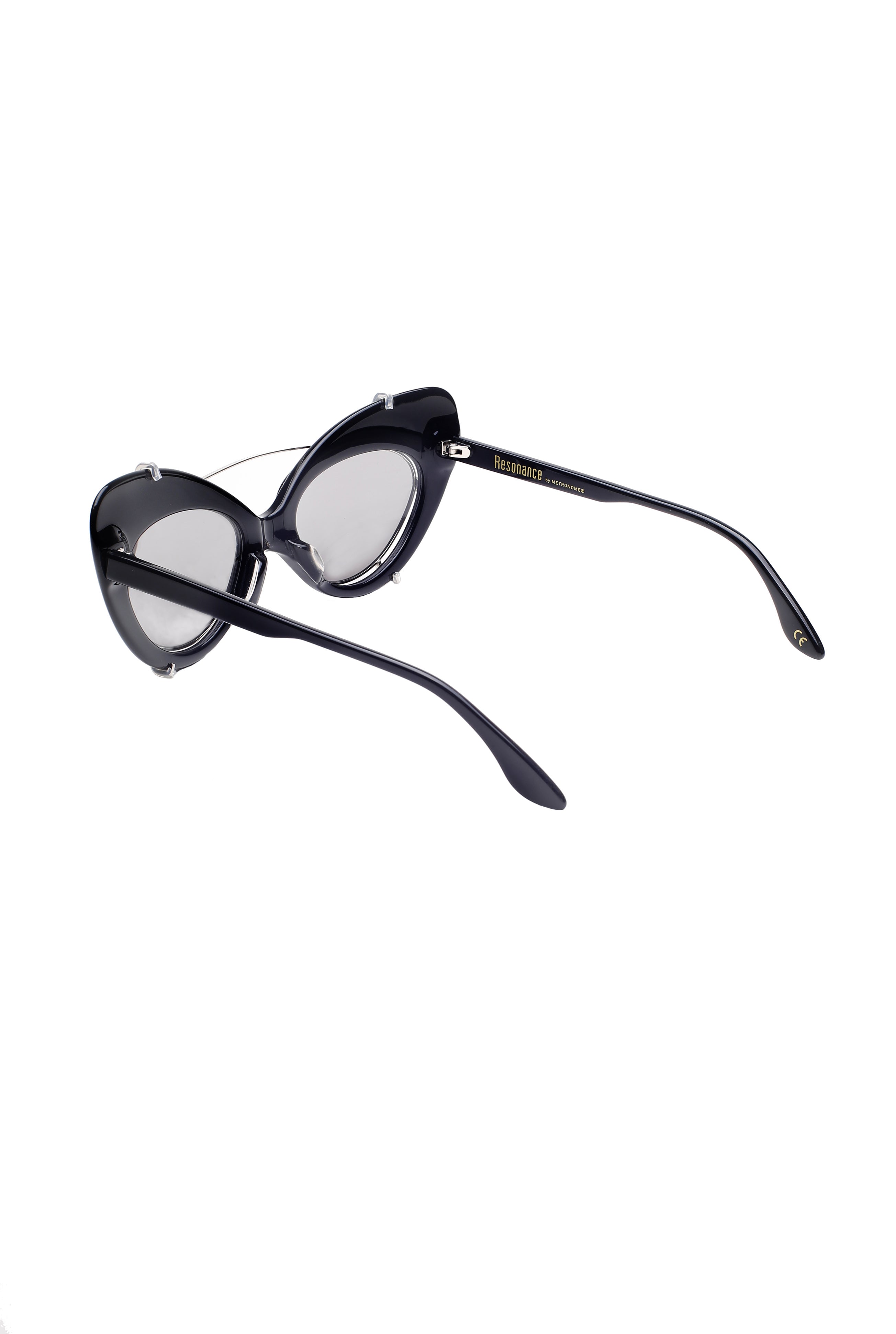 Metronome Resonance Grief optical model, transparent color + sunglasses clip, cat shape, handmade in acetate and metal in Japan.