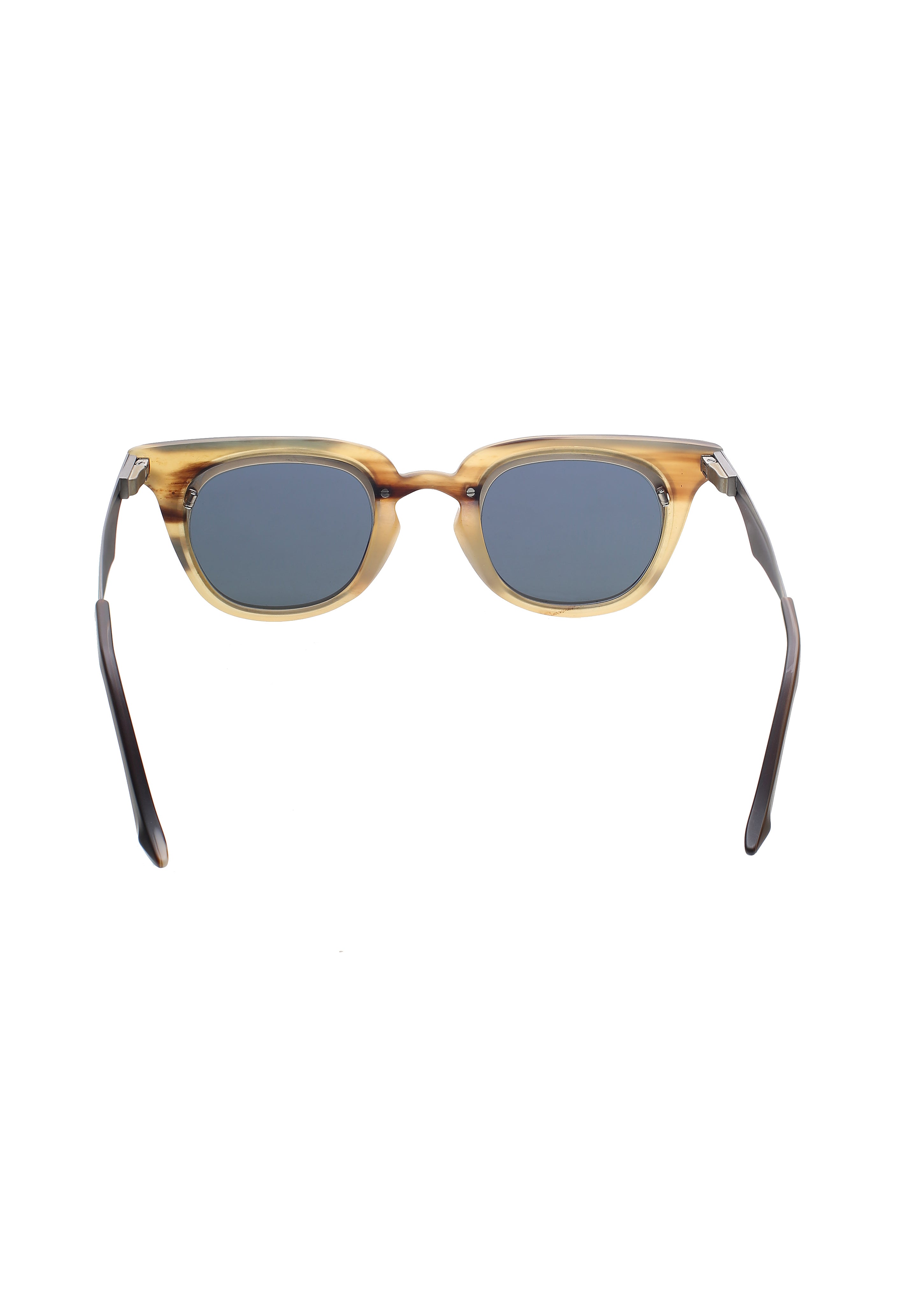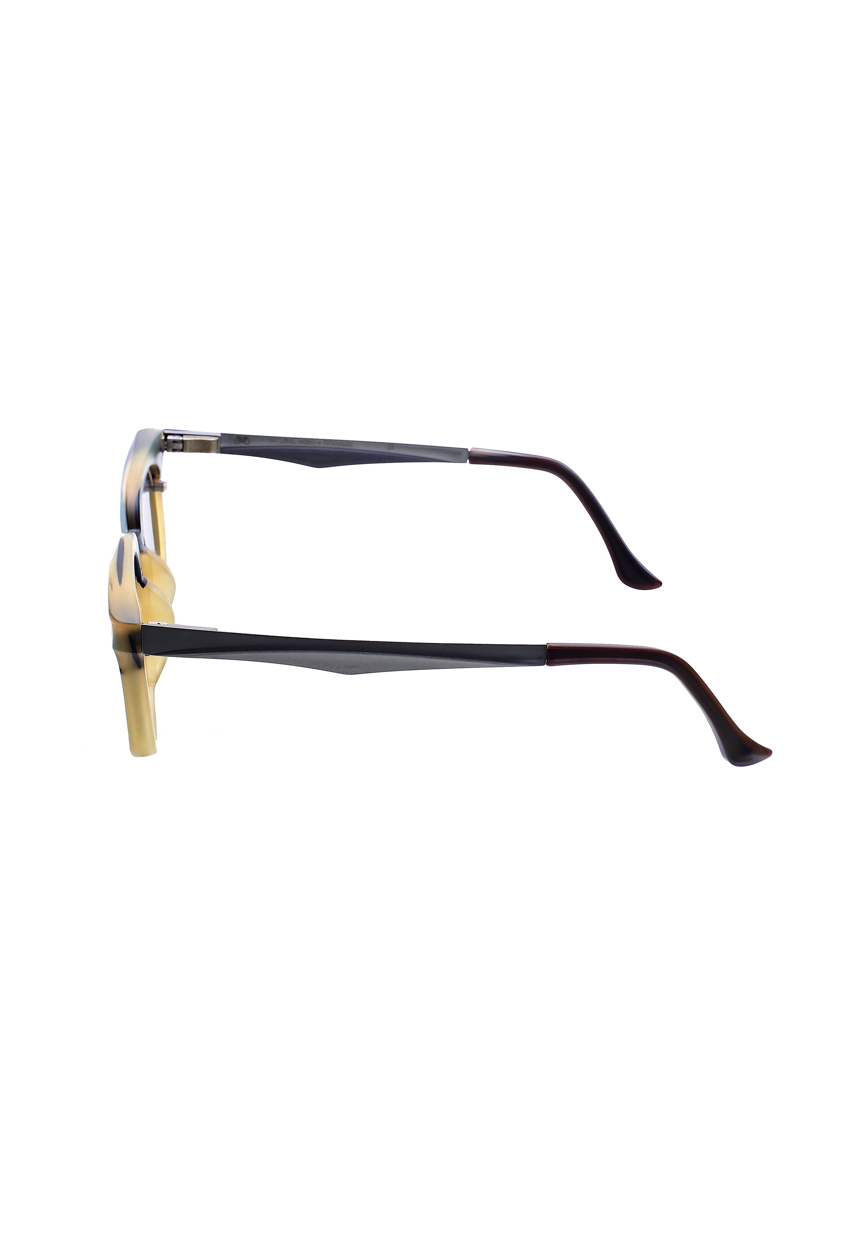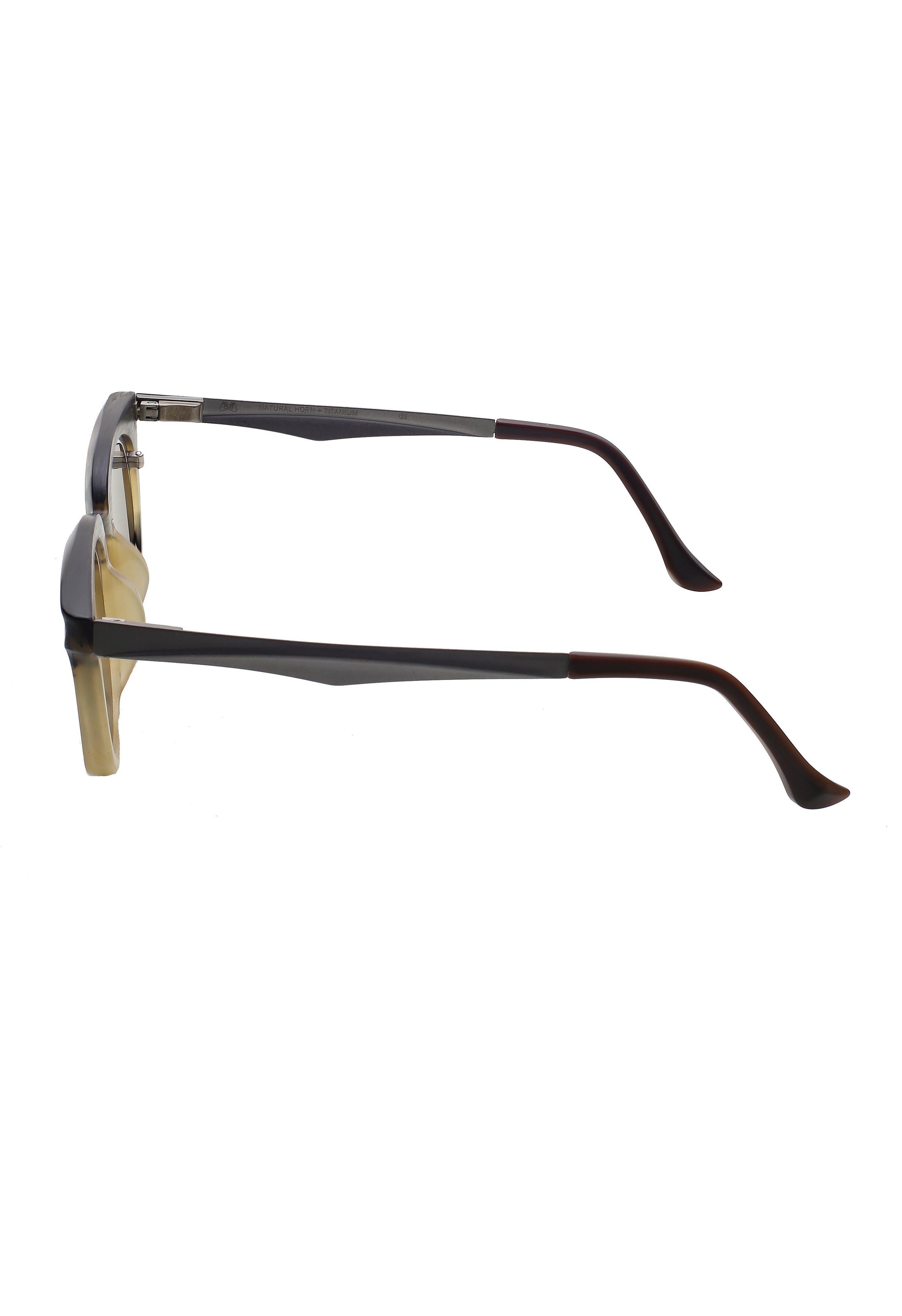 La struttura mette in dialogo la parte superiore scolpita in corno — con venature visibili e variazioni cromatiche uniche — e il frontale in titanio, più sottile e preciso, che dona leggerezza e stabilità. Le superfici rivelano micro-irregolarità tipiche della lavorazione manuale e conferiscono al modello un carattere distintivo, ideale per chi cerca occhiali artigianali con una forte identità estetica.