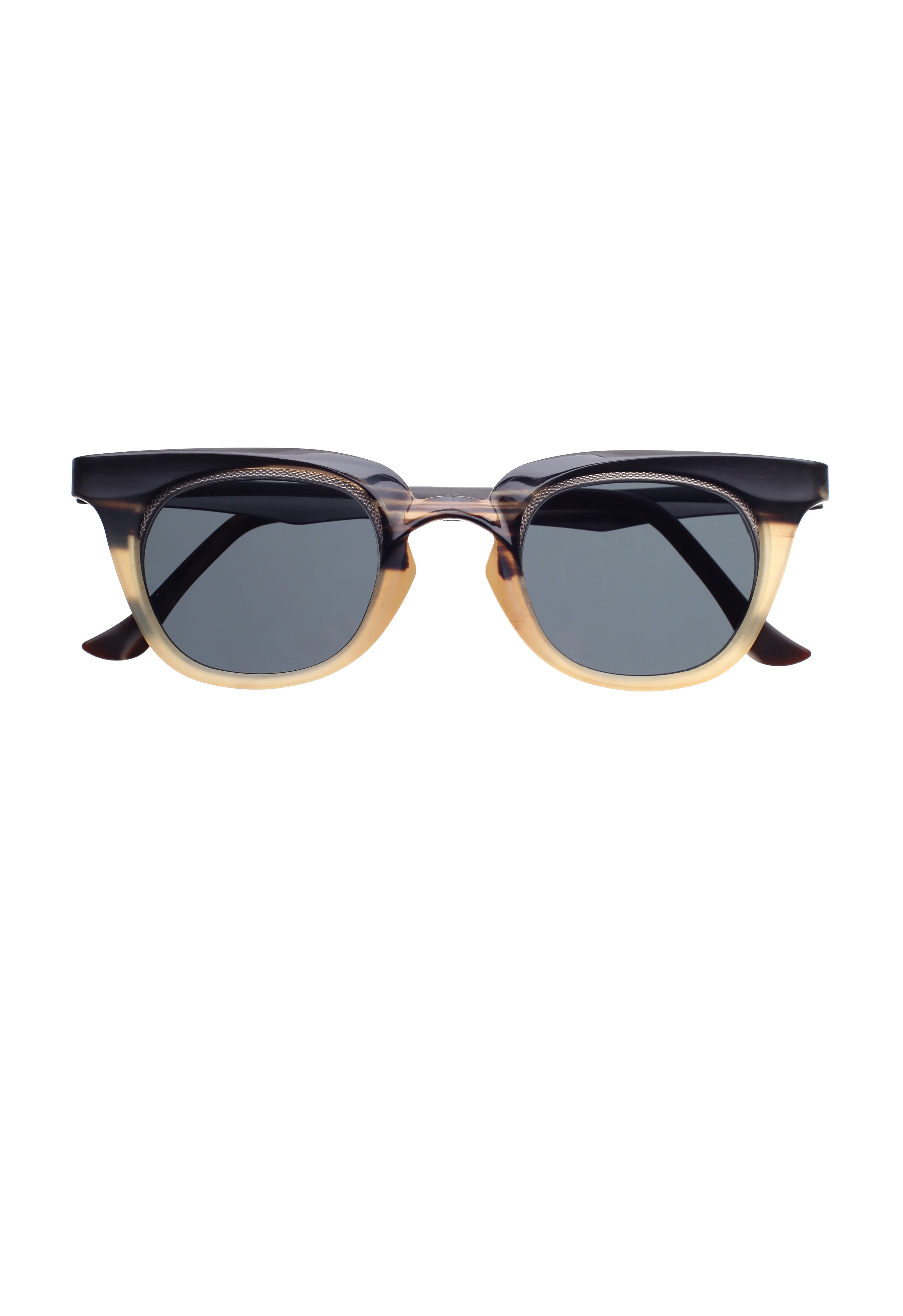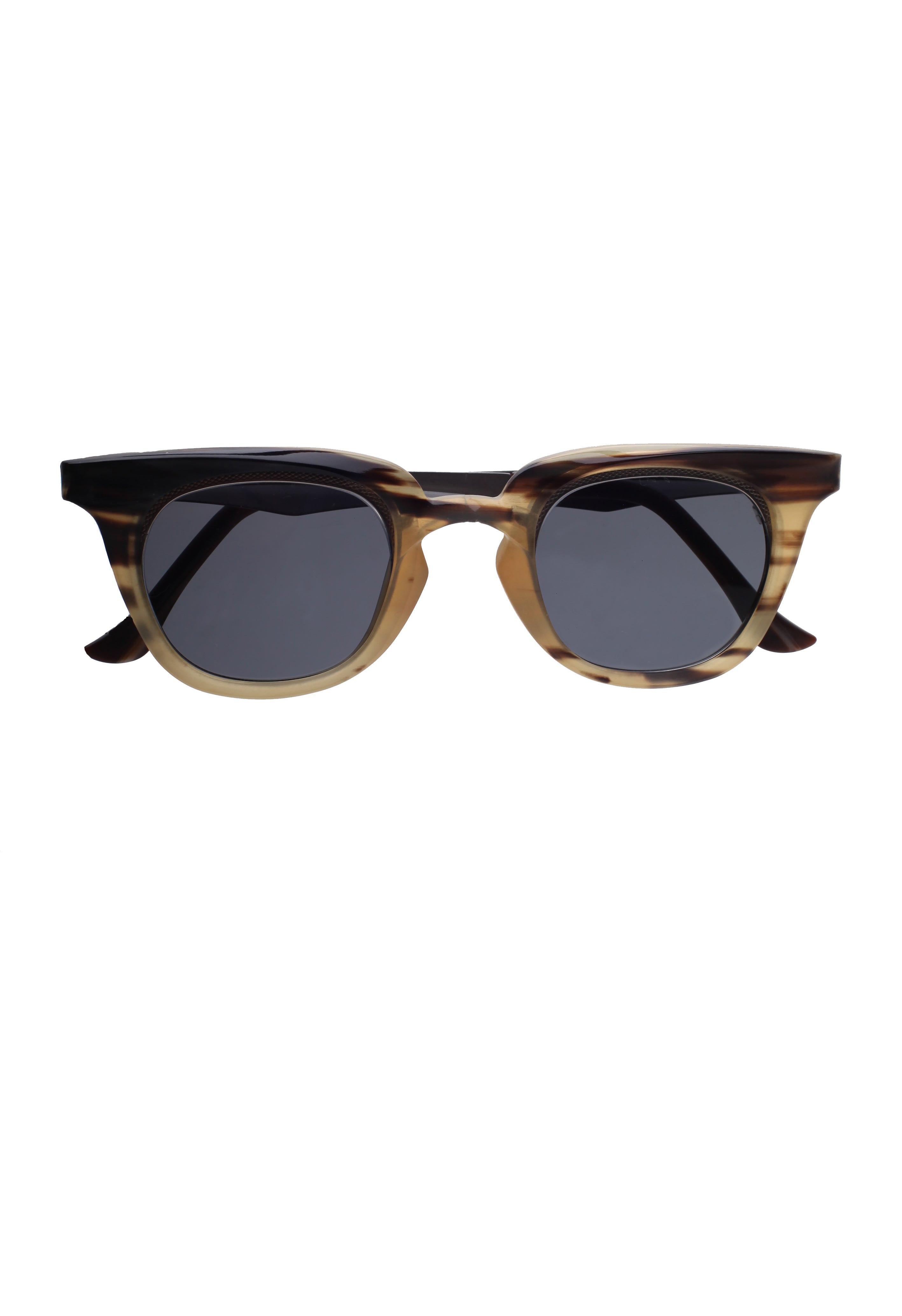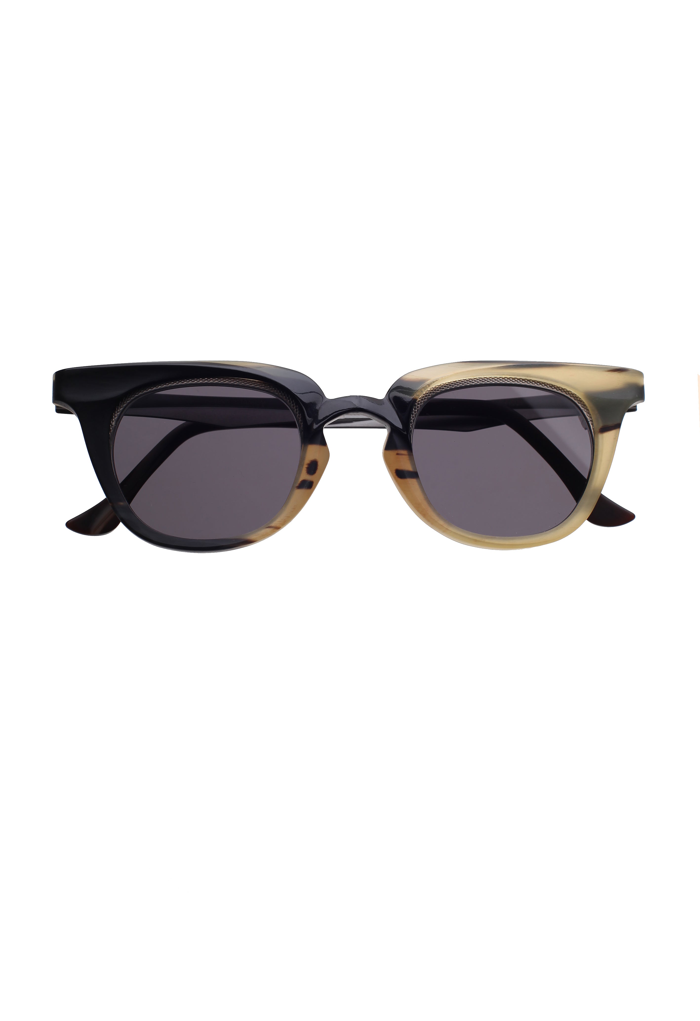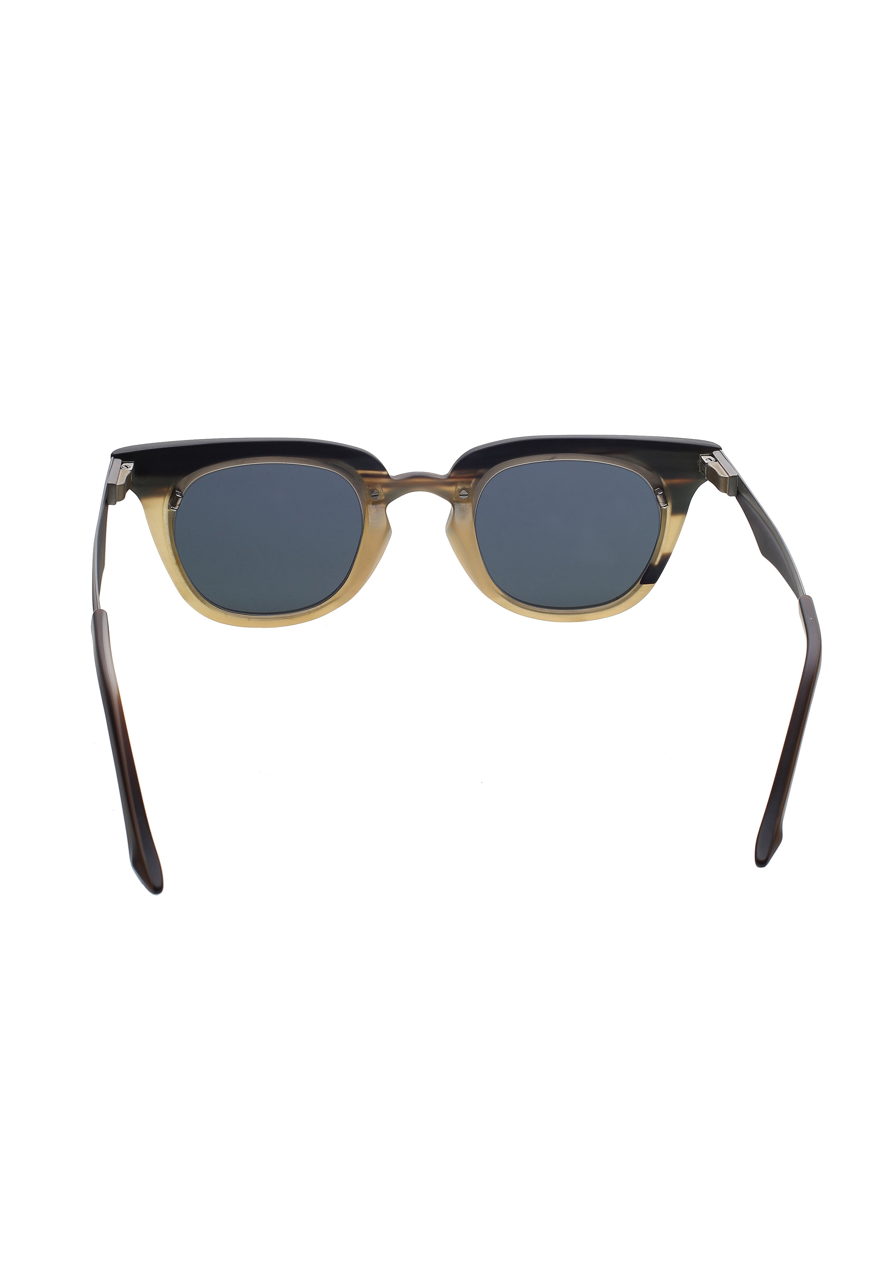 La struttura mette in dialogo la parte superiore scolpita in corno — con venature visibili e variazioni cromatiche uniche — e il frontale in titanio, più sottile e preciso, che dona leggerezza e stabilità. Le superfici rivelano micro-irregolarità tipiche della lavorazione manuale e conferiscono al modello un carattere distintivo, ideale per chi cerca occhiali artigianali con una forte identità estetica.