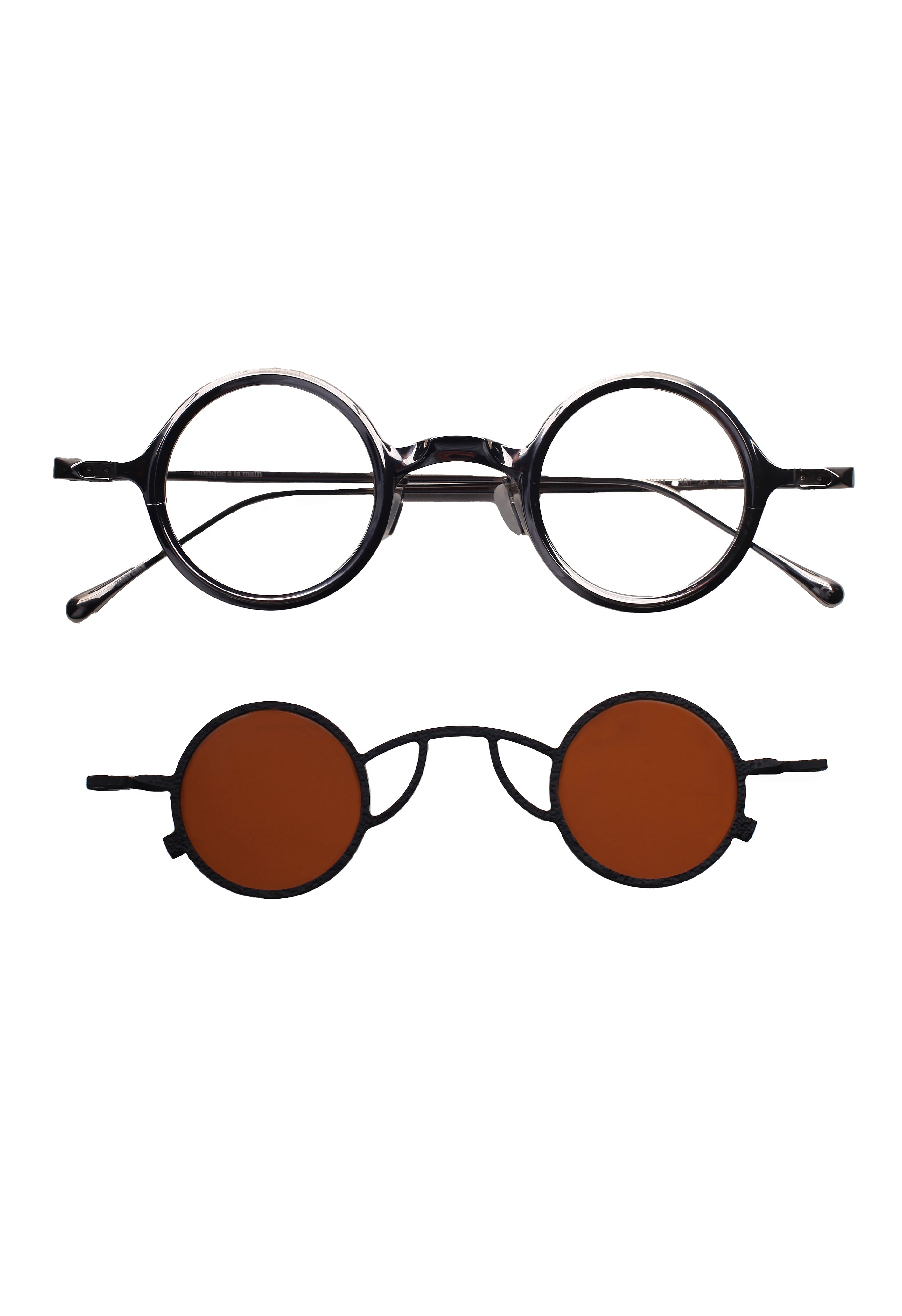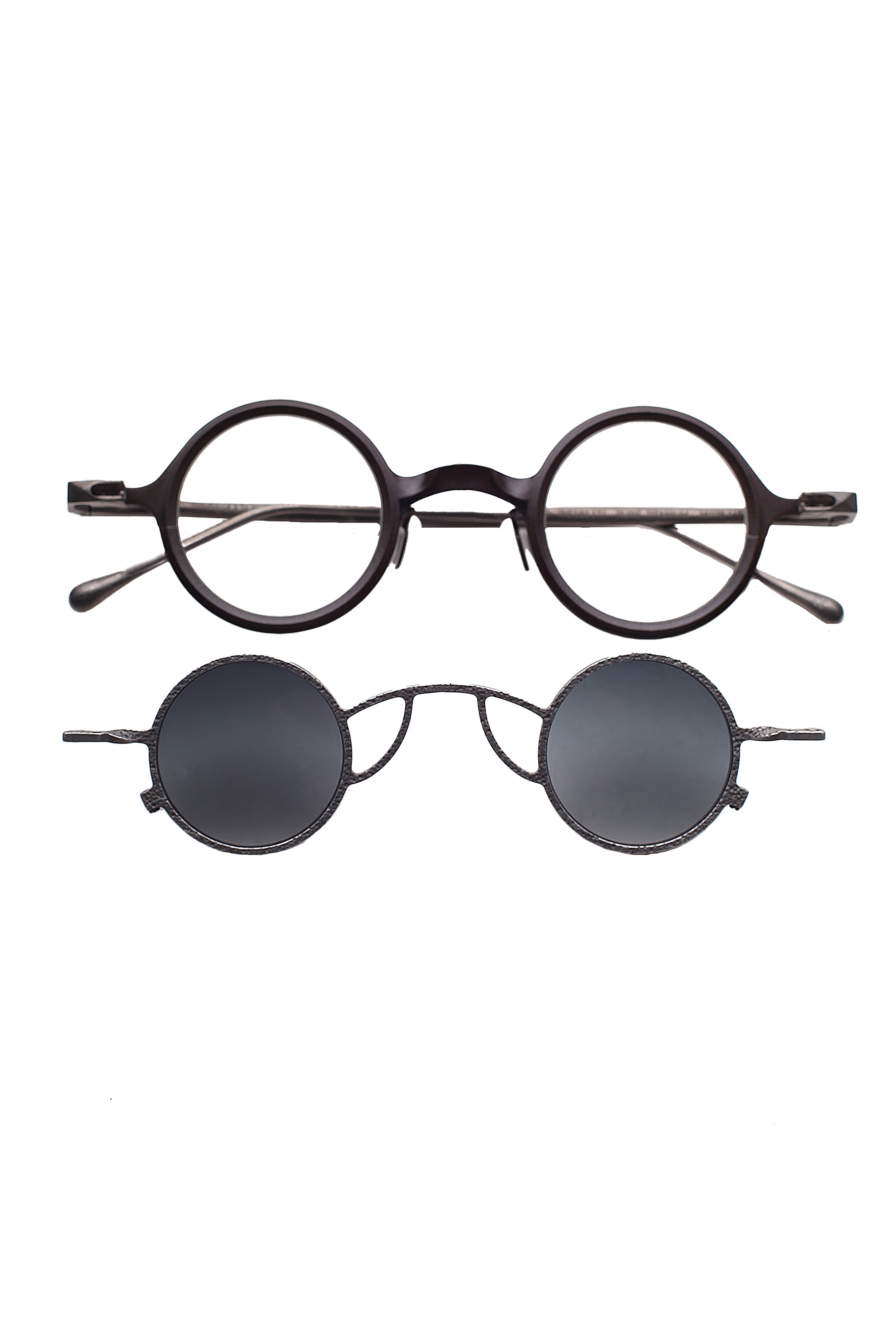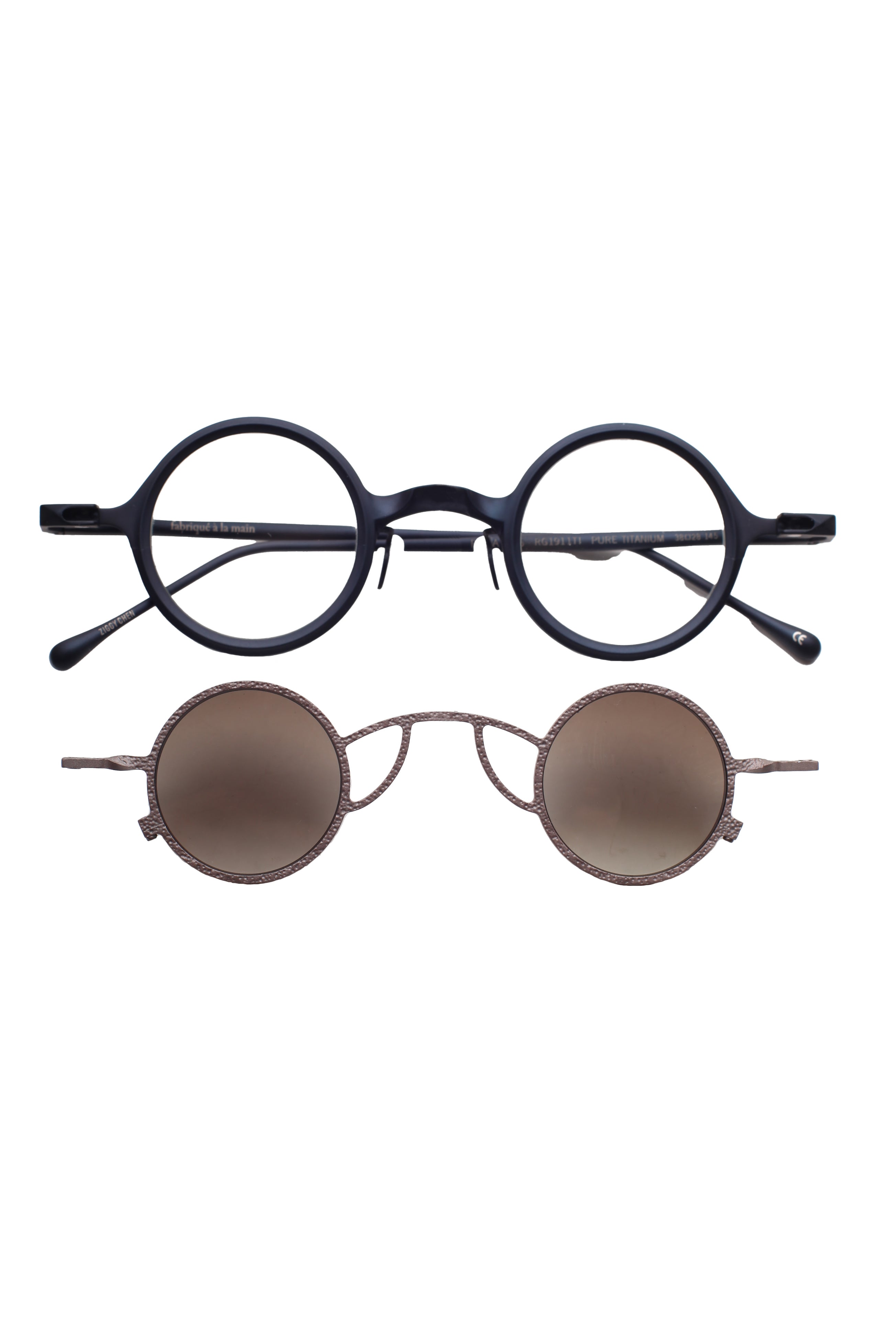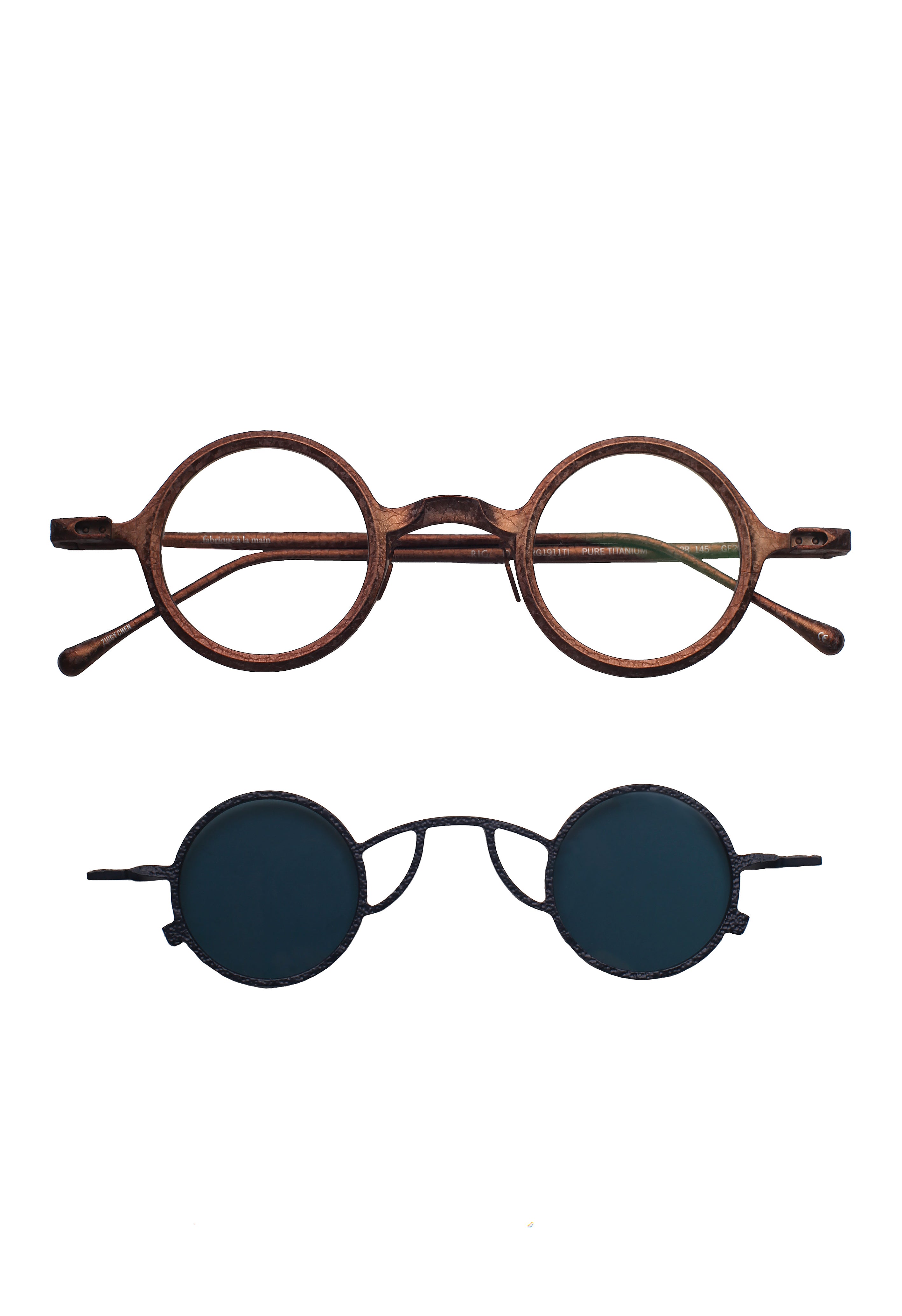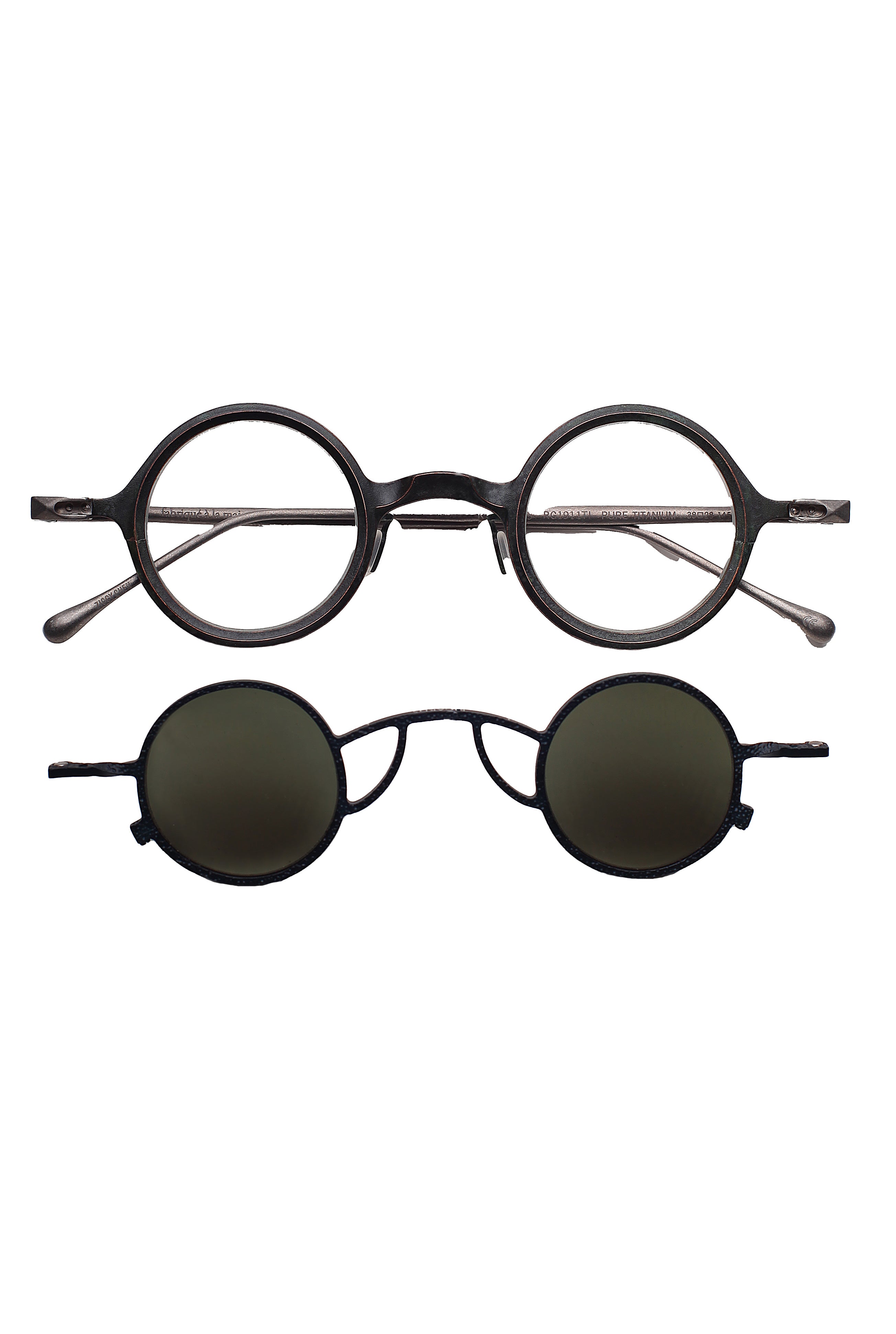 Ogni combinazione montatura–clip crea una continuità cromatica studiata, valorizzando le sfumature ossidate e la matericità del titanio.
