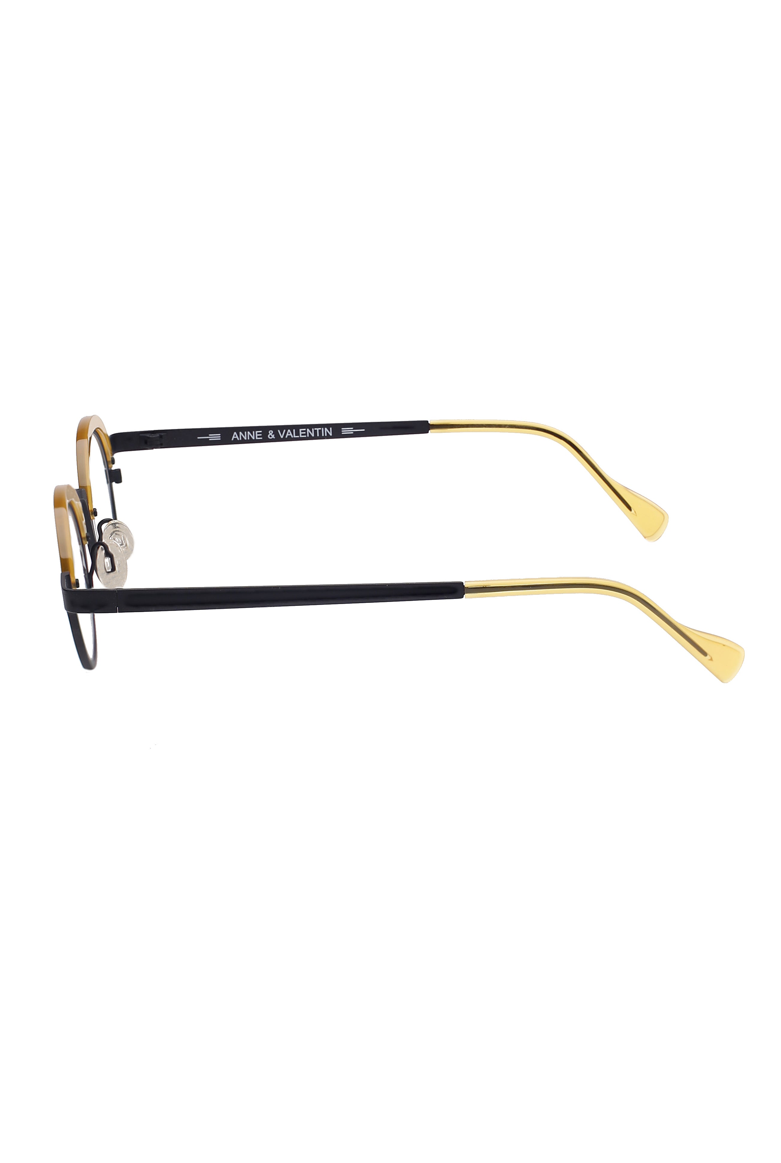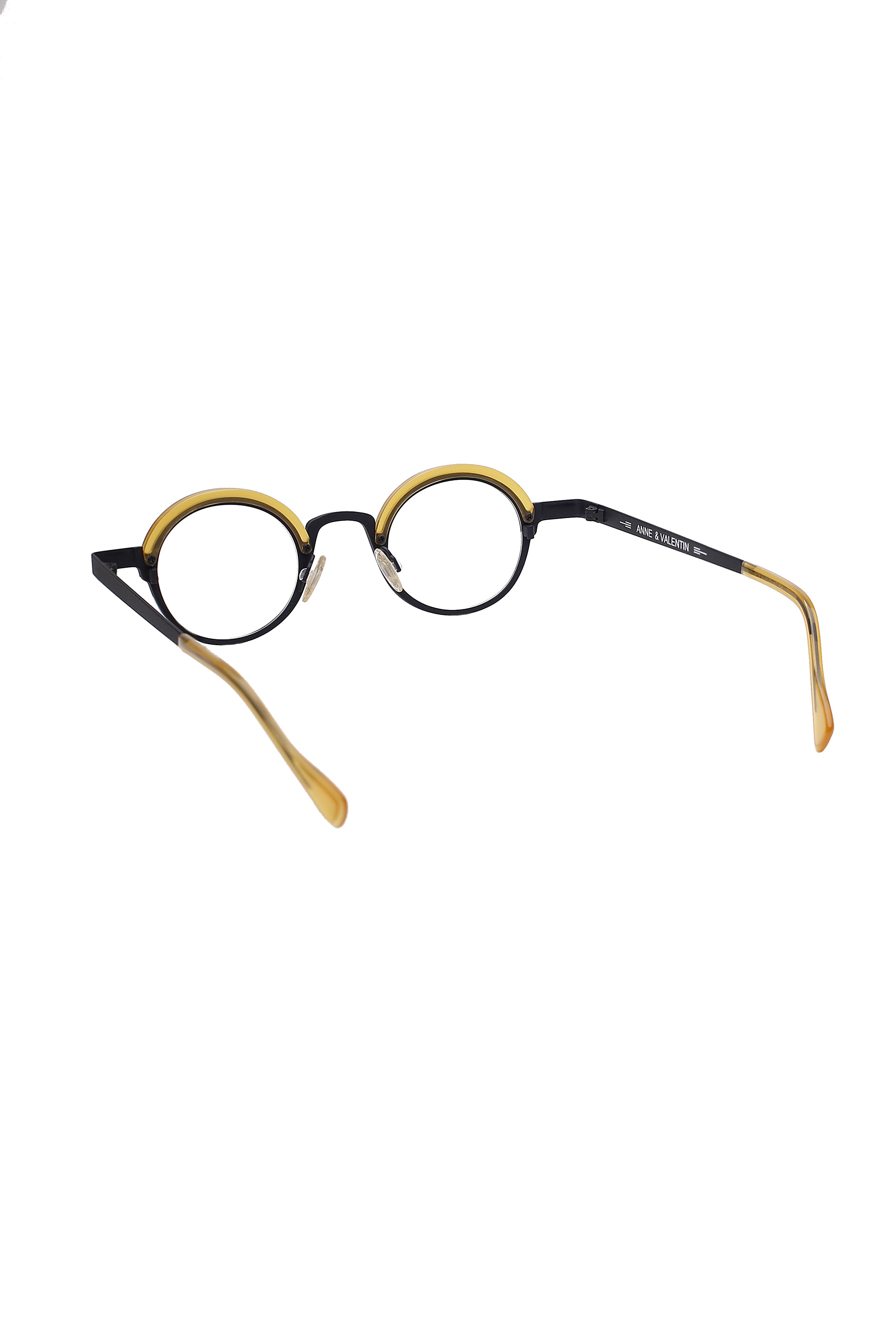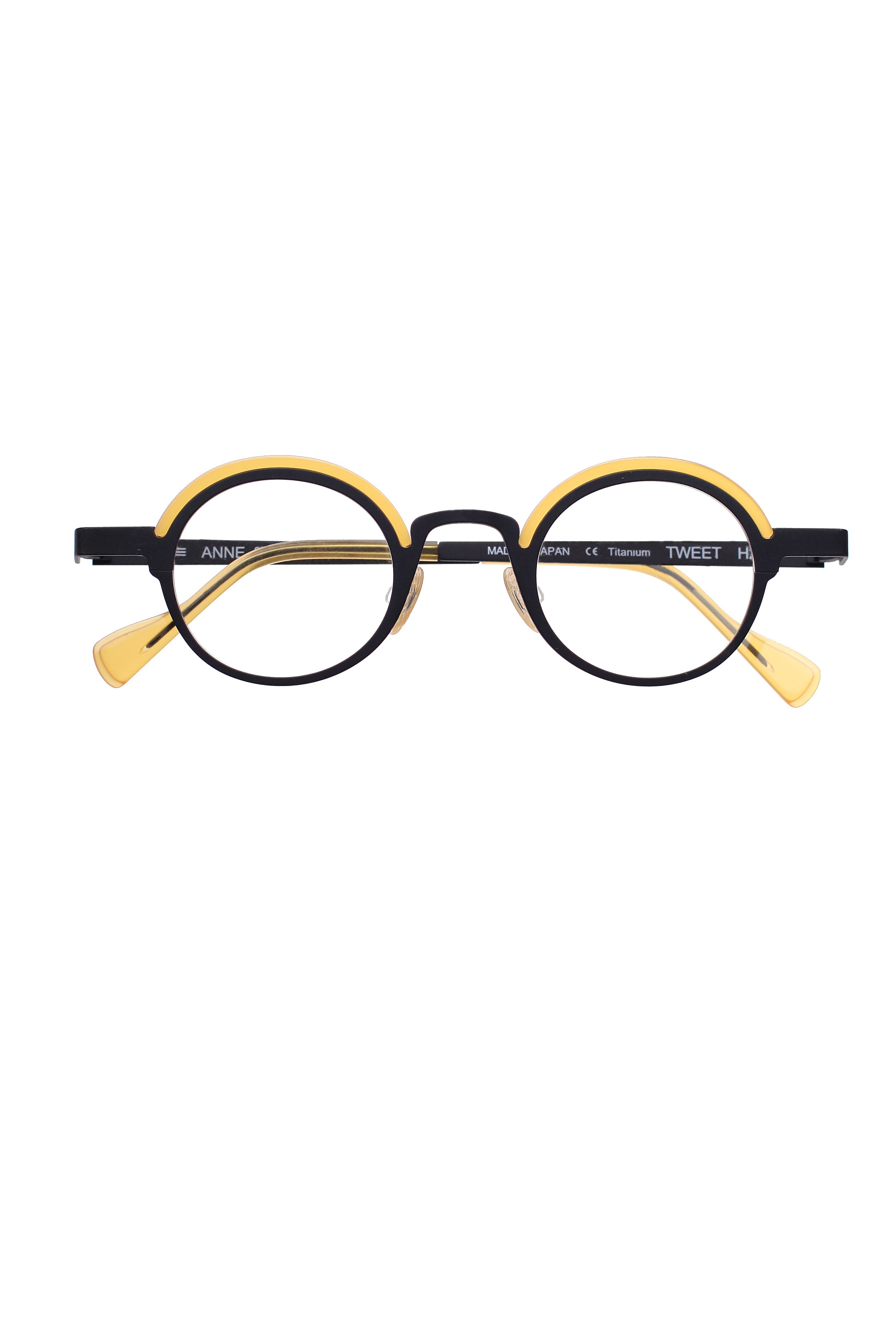 Anne Et Valentin Tweet h29 modello da vista colore nero e giallo, forma rotonda in titanio ed acetato fatto a mano in Giappone.