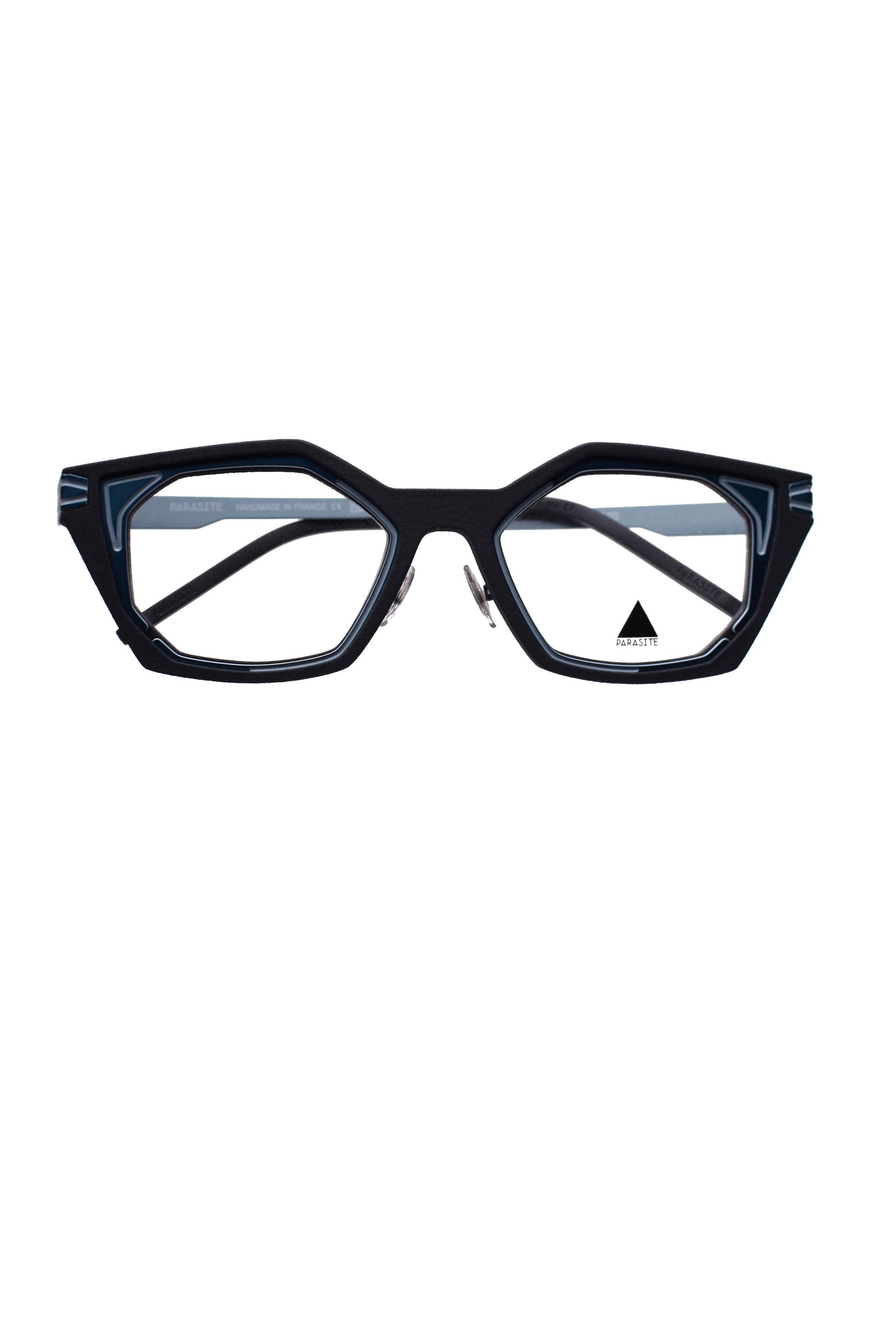 Parasite Particule 7 c67 modello da vista colore nero e azzurro, forma a farfalla in Poliammide 3d print e metallo fatto a mano in Francia.
