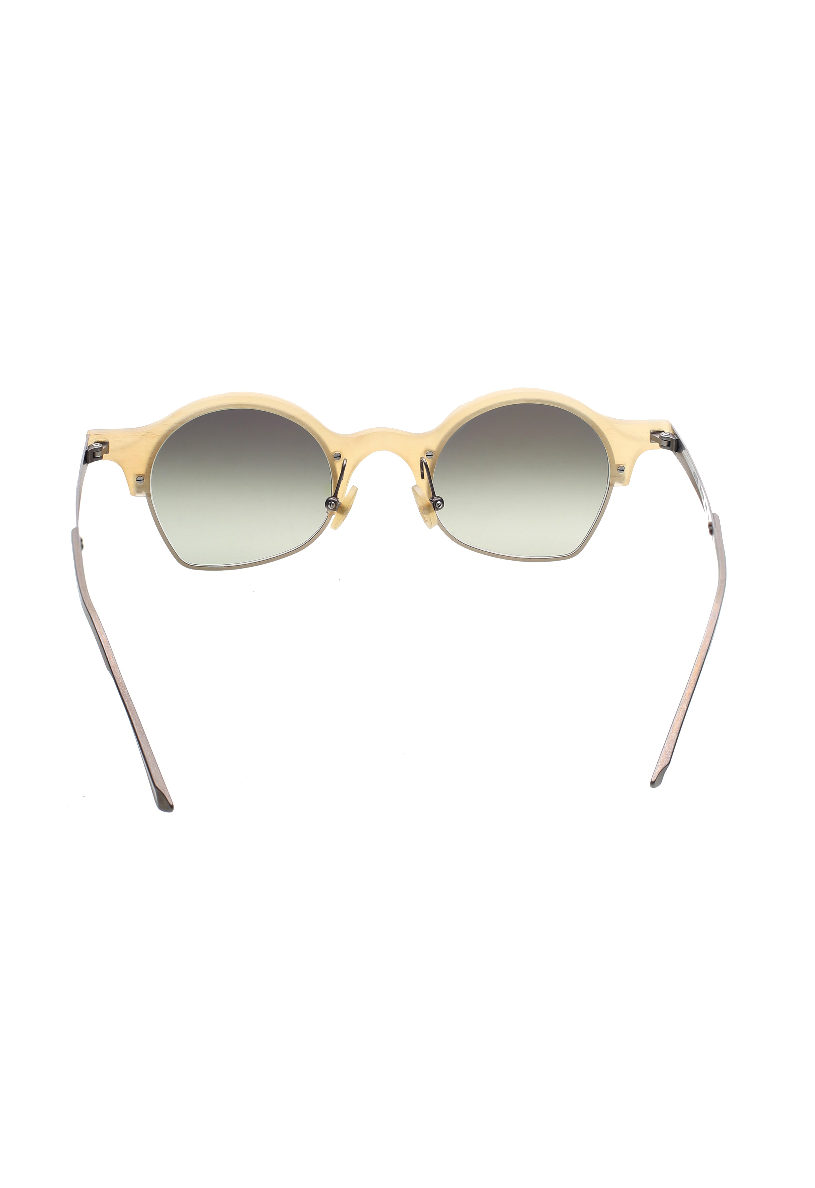 La montatura, lavorata interamente a mano, presenta superfici morbide e leggere variazioni tonali che rendono ogni pezzo unico, secondo l’approccio artigianale del brand.